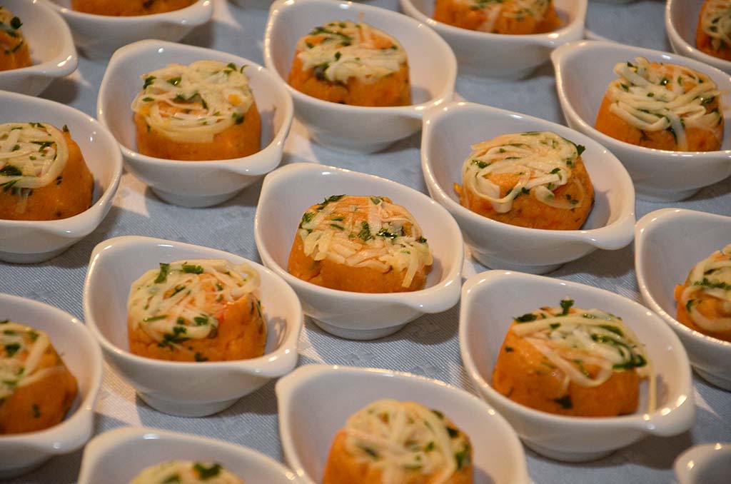 No coquetel e jantar foram servidos bebesse com minicuscuz, grandes bolas de lichia recheadas com creamcheese e gorgonzola, cumbucas de polenta italiana com vitela desfiada, bares com drinks italianos, vinho, prosecco e doces brasileiros como copinhos de brigadeiro e cocadinhas mole com calda de cana de açúcar.