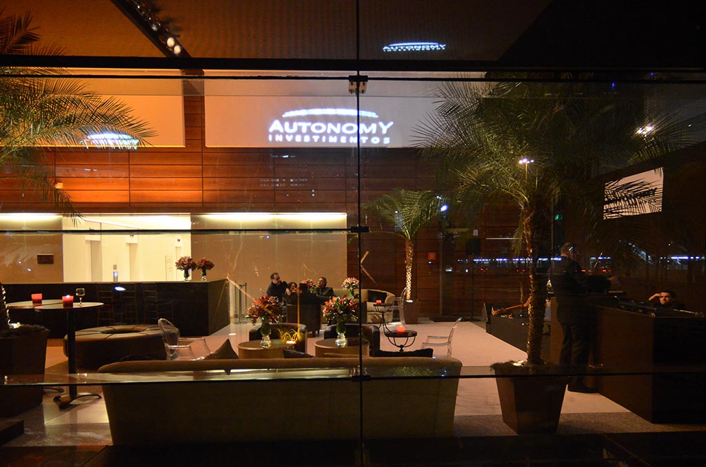 Fomos contratados para realizar o lançamento da empresa do mercado imobiliário no Brasil. O grande hall de entrada do edifício Rochaverá, sede das instalações da Autonomy Investments, foram cobertos por uma grande estrutura que transformou o vão em um grande espaço de luxo e glamour. As catracas do hall foram cobertas por painéis em madeira e veludo e foram transformadas em grandes balcões de bar, ilhas em couro e espelhos com grandes orquídeas decorando o ambiente.