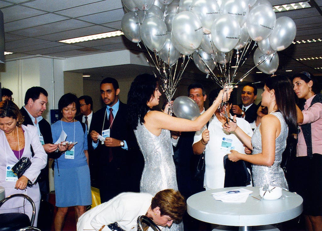 Confeccionamos todo o estande desse evento durante o Congresso da ABRAPP para o banco alemão Deutsche Bank, desenvolvemos a comunicação visual, contratamos recepcionistas bilíngues português- alemão-inglês, criamos uma atração diária onde as recepcionistas distribuíam durante 2 horas bexigas para os convidados estourarem. Dentro de cada bexiga havia diversos brindes: copos com o logotipo de banco, canetas personalizadas, sacolas e um brinde especial que era sorteado uma vez ao dia: um passeio de helicóptero de 5 minutos na cidade de São Paulo.